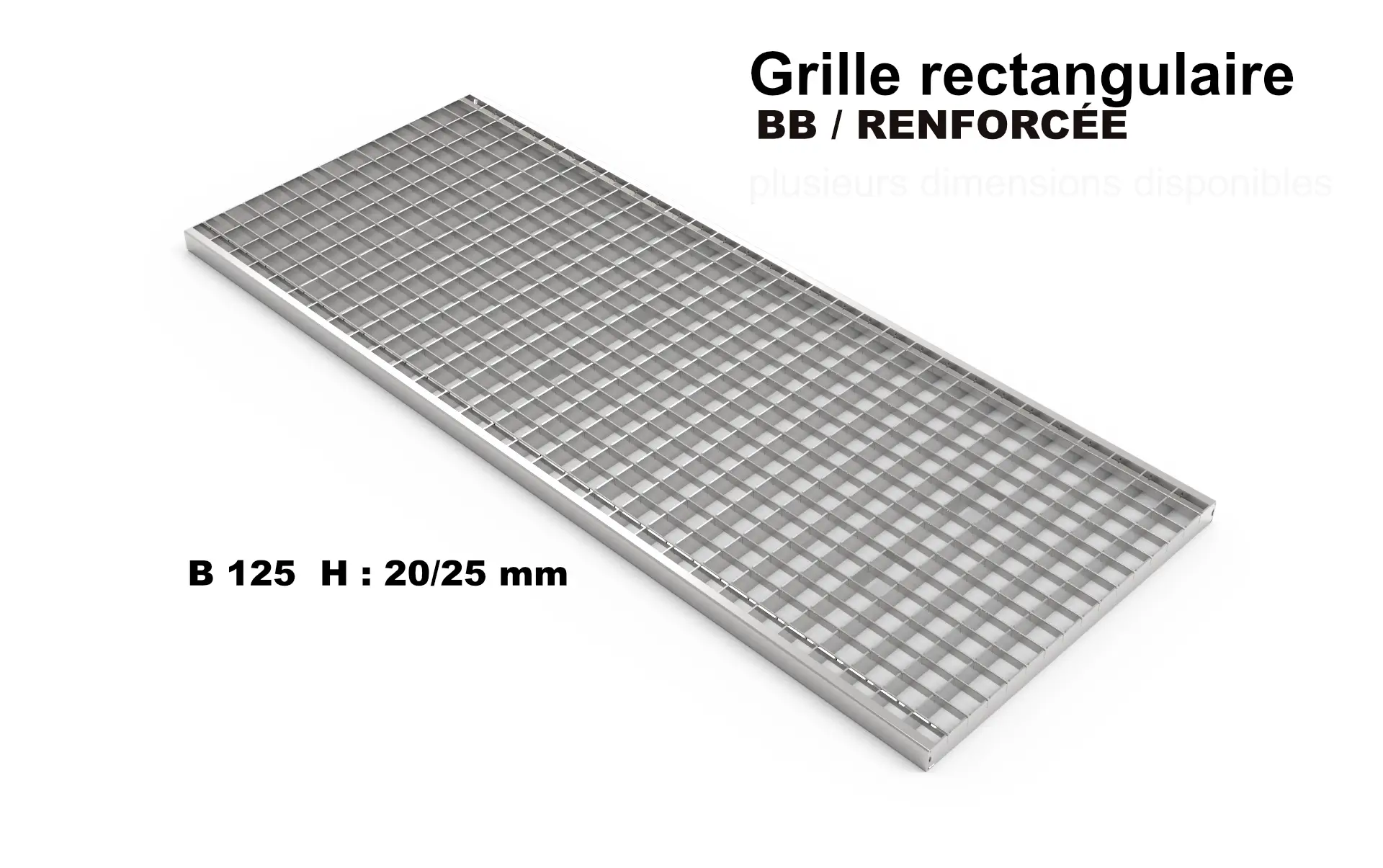 Grille caillebotis renforcée 130 x 1000 x 25mm en acier galvanisé 10 002 005 – Classe B125. La grille rectangulaire est conçue pour les zones de passage de véhicules légers et poids lourds, garantissant une résistance mécanique élevée grâce à son renforcement spécifique “B/B”.